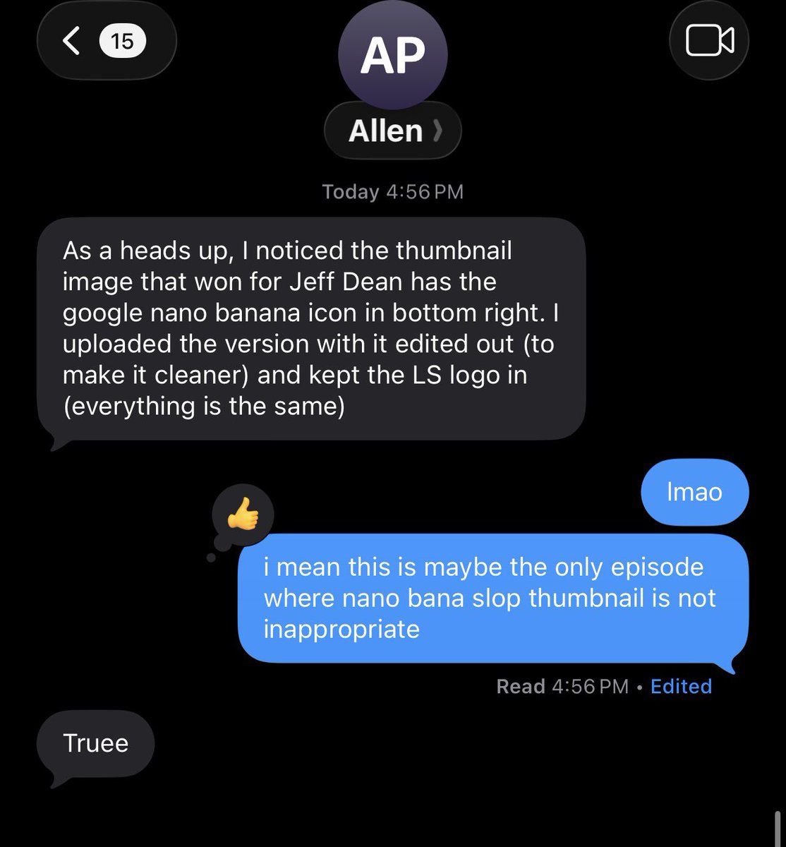 Jeff Dean 播客表现很好,但 A/B 测试显示 Gemini 生成的缩略图比人工精心制作的点击率更高。