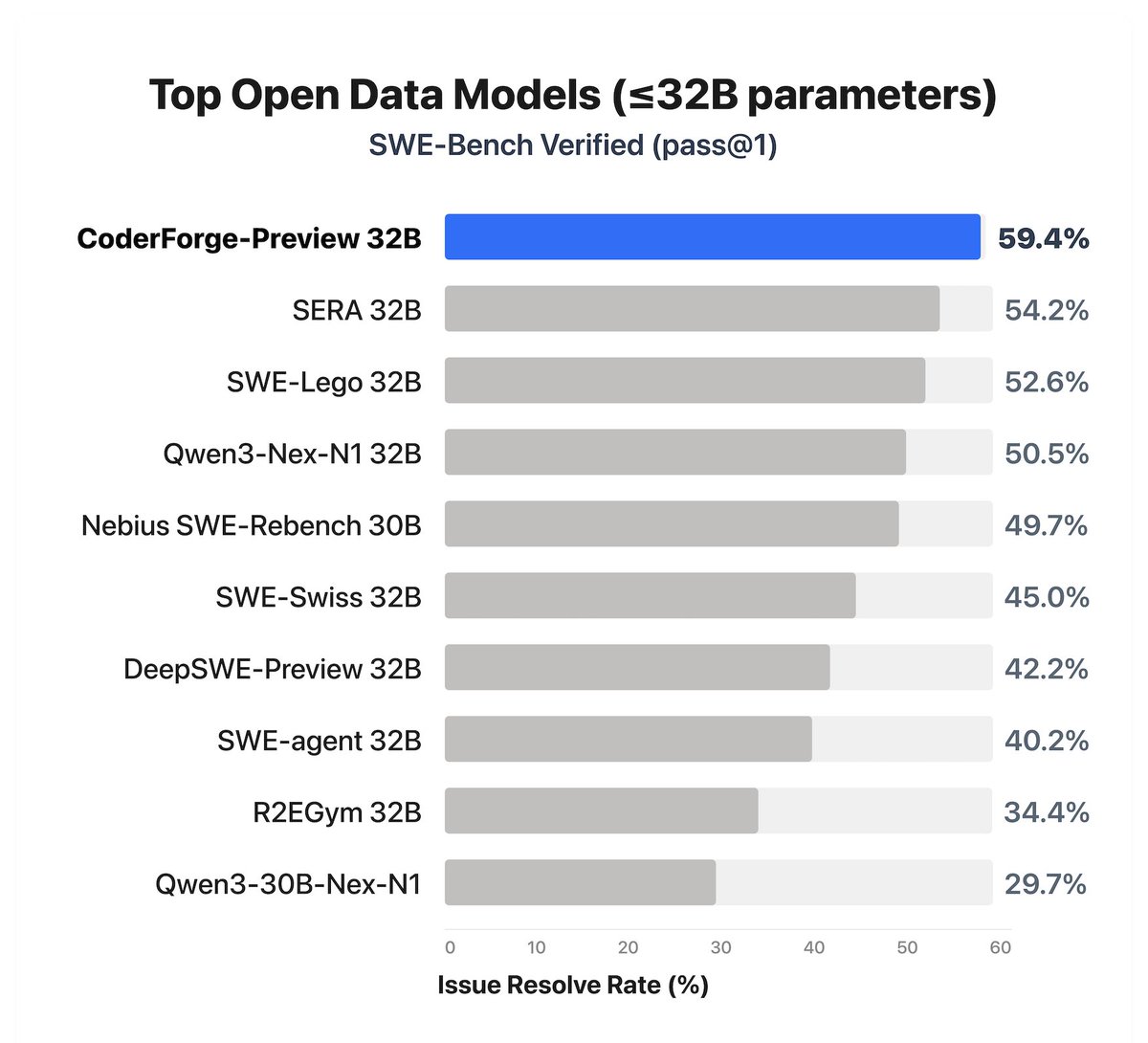 Together AI 开源 CoderForge-Preview 数据集,包含 25.8 万条测试验证的编码代理轨迹。微调 Qwen3-32B 后 SWE-bench 通过率从 23% 飙升至 59.4%,32B 以下开放数据模型中排名第一。